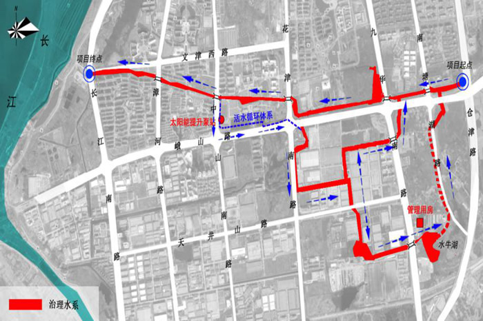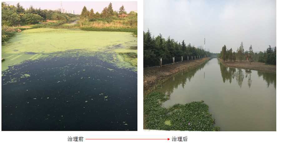 弋江區(qū)黑臭水體治理澛港水系示范項(xiàng)目的主水系明渠長約4.86km,匯水區(qū)面積約3.6km2,平均寬度約29.46m,治理水面積約0.15km2。該項(xiàng)目為住建部掛牌的黑臭水體治理項(xiàng)目,水體黑臭現(xiàn)象嚴(yán)重,生活污水、工業(yè)廢水直排河道,水體富營養(yǎng)化嚴(yán)重。我公司采用“三鏈”網(wǎng)式生態(tài)修復(fù)技術(shù),再結(jié)合淤泥疏浚、控源截污、雨污混流預(yù)處理、曝氣復(fù)氧、生態(tài)浮島、生物強(qiáng)化等環(huán)境工程工藝措施,運(yùn)營6個(gè)月后整個(gè)水體完全消除黑臭,部分水質(zhì)指標(biāo)達(dá)到地表水Ⅳ類水標(biāo)準(zhǔn)。